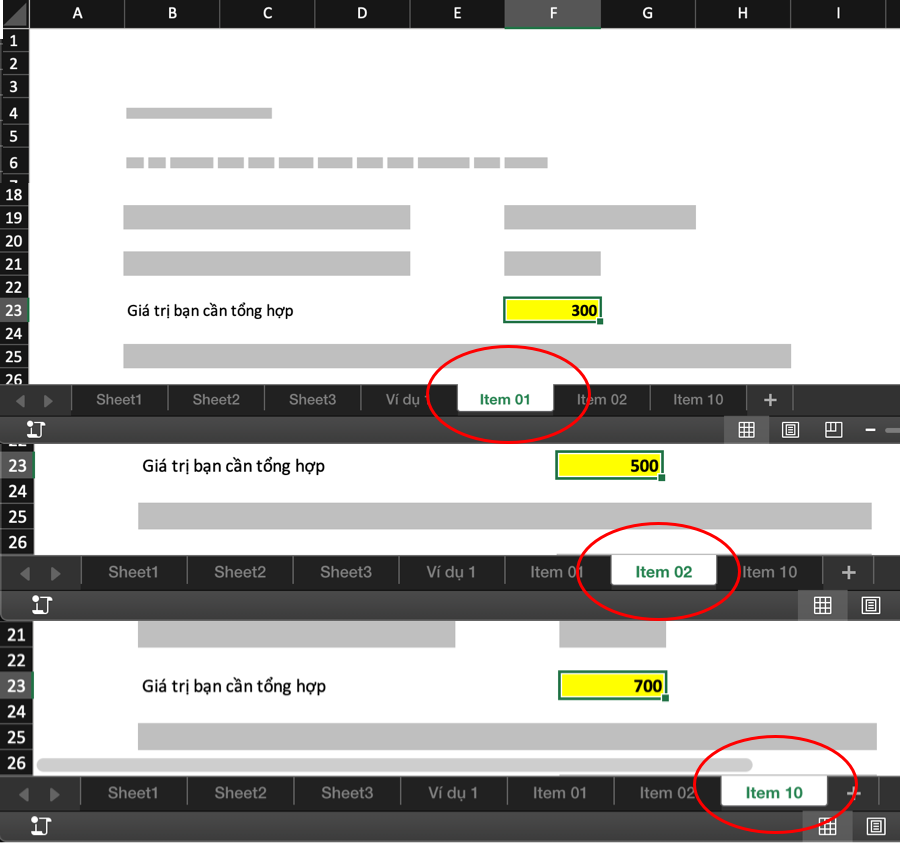 Trong một số công việc, bạn có thể lưu dữ liệu của nhiều sản phẩm vào nhiều sheets khác nhau trên Excel, mỗi sheet tương ứng với một sản phẩm. Mỗi sản phẩm lại có một bảng thuộc tính riêng của từng sản phẩm. Đây là một cách lưu trữ rất tốt, và khoa học. Nhu cầu bây giờ của bạn cần tổng hợp dữ liệu từ các sheet sản phẩm đó vào một bảng tổng hợp, làm sao để làm được điều này khi chúng ta có tới cả trăm sheets? Trong ví dụ sau đây, mình sẽ minh hoạ với trường hợp có 3 sheets