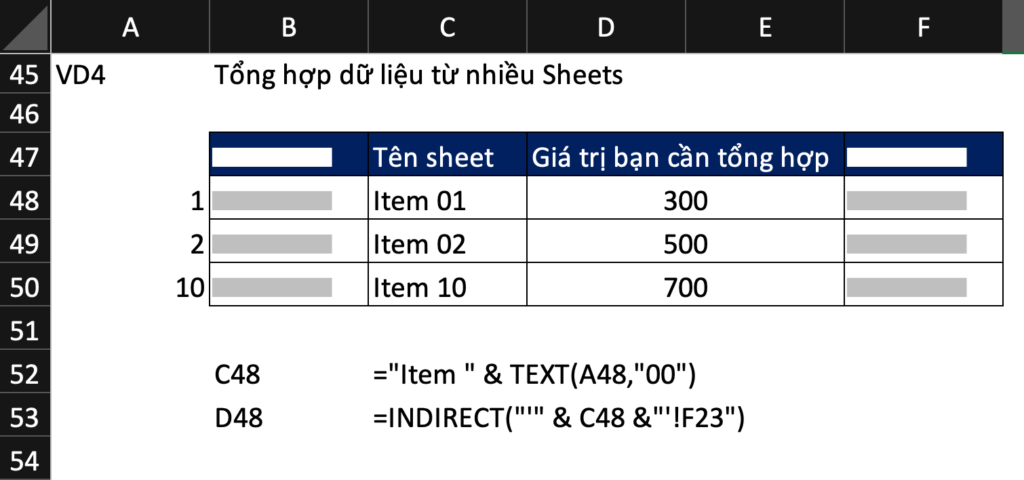 Trong ô C48, chúng ta sử dụng hàm Text và kỹ thuật nối chuỗi trong Excel để tạo ra tên sheet. Tên sheet này sẽ được sử dụng trong công thức Indirect ở ô D48 để lấy dữ liệu từ ô F23 của các Sheet như trên.