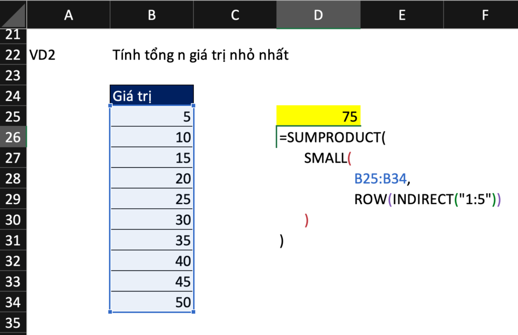 SUMPRODUCTcuối cùng sẽ đi tính tổng của 5 giá trị nhỏ nhất này.