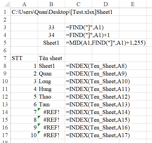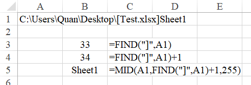 - Tách phần tên Sheet bằng cách lấy toàn bộ số ký tự sau dấu ] : trước dấu ] là đường dẫn và tên workbook, sau dấu ] là tên sheet