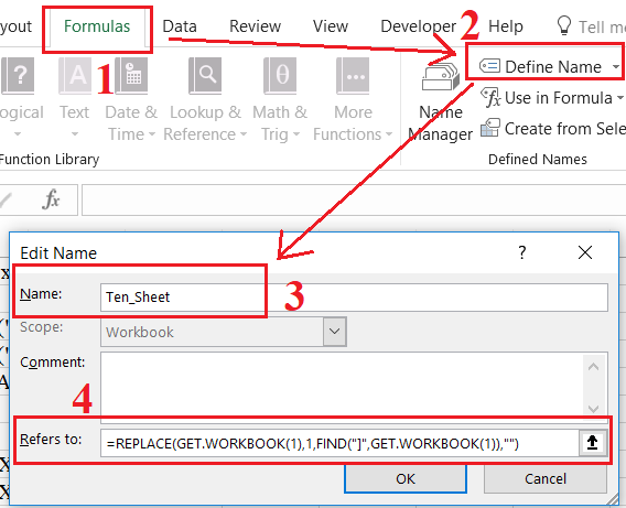 Bước 1: Tạo 1 tên động xác định tên Sheet