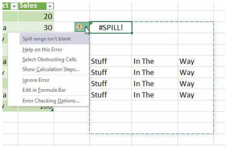 Trong phiên bản Excel với kiểu công thức mảng mới này, 1 lỗi mới được giới thiệu tới người sử dụng, đó là lỗi #SPILL!. Lỗi này xảy ra trong trường hợp có dữ liệu trong phạm vi mở rộng (Spill Range) của công thức mảng kiểu mới. Cụ thể như trong hình minh họa