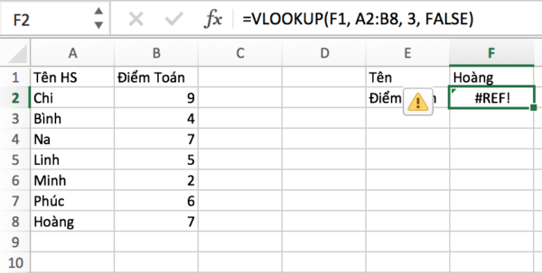 Vậy tại sao lỗi #REF lại xảy ra? Đó là vì tham số col_index_num khi được đặt bằng 3 đã thông báo cho Excel để lấy một giá trị từ cột thứ 3, trong khi hiện tại lại chỉ có 2 cột trong bảng.