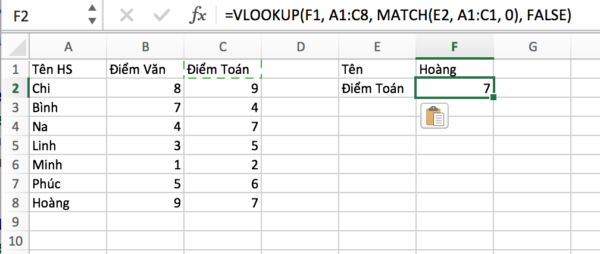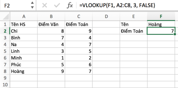 Tham số thứ 3 (col_index_num) được đặt là 3 vì Điểm toán mà chúng ta muốn kéo nằm ở cột thứ 3 trong bảng. Trong hình dưới đây, hàm Vlookup làm việc bình thường