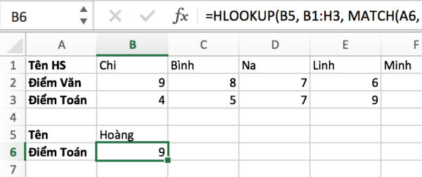 Để hiểu hơn hàm MATCH, các bạn có thể tạo một công thức đơn giản dựa trên dữ liệu sau: Tên học sinh ở cột A và điểm ở cột B, sắp xếp theo thứ tự giảm dần. Để tìm ra vị trí một học sinh cụ thể (ví dụ Hoàng), sử dụng công thức sau:
