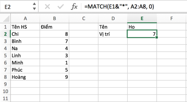 Trong bức ảnh trên, tên học sinh được nhập vào dãy một cách ngẫu nhiên, do đó chúng ta đặt match_type bằng 0 vì loại này không yêu cầu sắp xếp giá trị trong dãy tìm kiếm. Công thức MATCH cho chúng ta biết rằng Hoàng đứng ở vị trí thứ 7 trong dãy giá trị tìm kiếm.