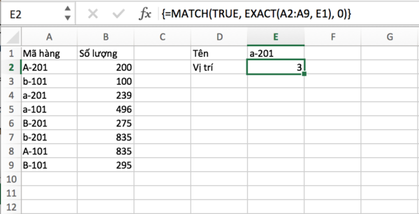 Hàm MATCH trong Excel không phân biệt được dạng chữ. Do vậy, để phân biệt dạng chữ, ta gắn thêm hàm EXACT vào chuỗi tìm kiếm lookup_array, và nhớ ấn tổ hợp Ctrl + Shift + Enter