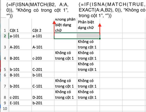 =IF (ISNA (MATCH (TRUE, EXACT (A:A, B2), 0)), “Không có trong cột 1”, “”)