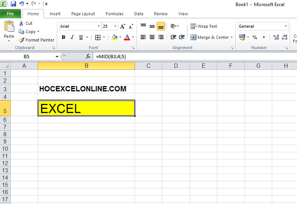1/ Lấy ra 5 ký tự trong chuỗi đã cho bắt đầu từ vị trí số4 với công thức: =MID(B3;4;5).