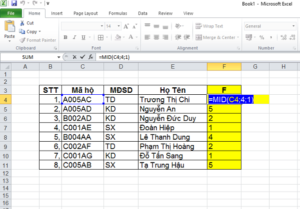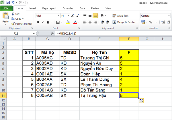2/ Tại cột F, lấy ra 1 ký tự, bắt đầu từ vị trí số 4 trong các ô thuộc cột Mã hộ trong bảng số liệu dưới đây.