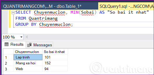 Giả sử, ta có bảng dữ liệu tên Quantrimang như sau: