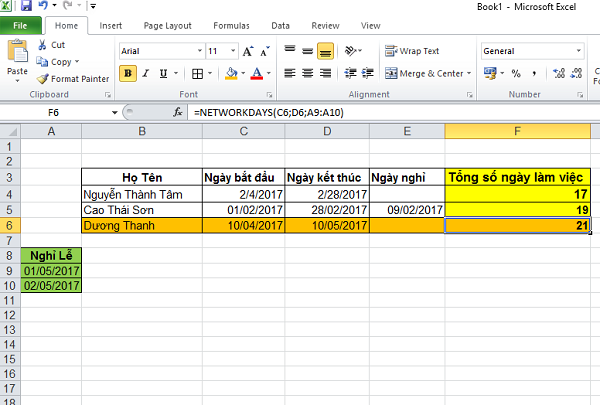 3/ Giả sử trong tháng có 2 ngày nghỉ Lễ thì số ngày làm việc của nhân viên được tính theo công thức: =NETWORKDAYS(C6;D6;A9:A10)