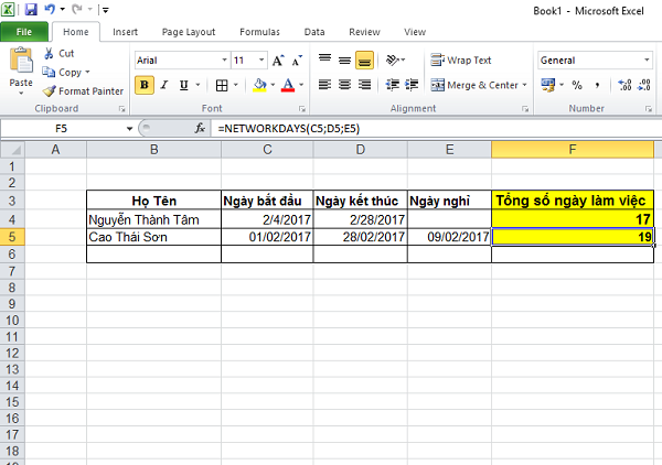 2/ Nếu nhân viên có 1 ngày nghỉ trong tháng, dùng công thức:=NETWORKDAYS(C5;D5;E5)