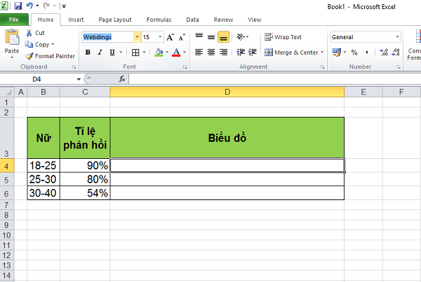 2/ Dùng hàm REPT để vẽ biểu đồ ngang dựa trên số liệu cho sẵn. Phần biểu đồ sử dụng Font chữ Webdings và công thức là: =REPT(“g”; 100 * C4 / 5)