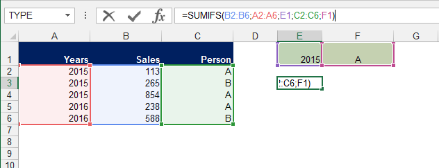 =SUMIFS(B2:B6,A2:A6,E1,C2:C6,F1)