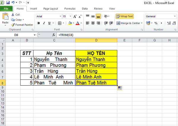 Hàm TRIM trong Excel dùng để loại bỏ tất cả những khoảng trống không cần thiết ra khỏi văn bản, chỉ để lại một khoảng trống giữa các từ.