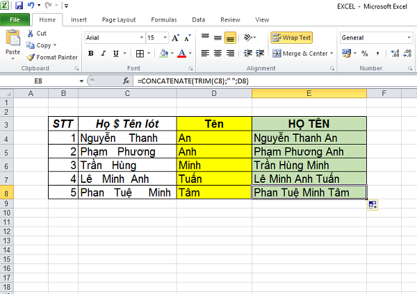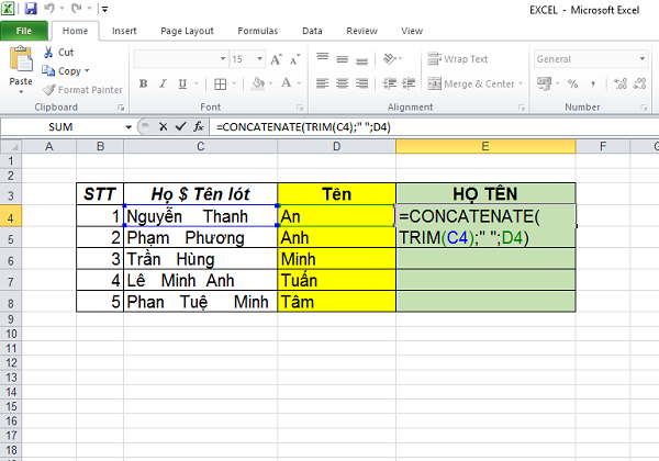 - Dùng công thức =CONCATENATE(TRIM(C4);” “;D4) nối 3 chuỗi gồm, 1 chuỗi ở cột Họ & Tên lót, 1 khoảng trống và chuỗi ở cột Tên, ta có đáp án.