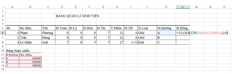 Ta có: =VLOOKUP(K6;$A$12:$B$14;2;0) các bạn chú ý vì mình sử dụng Excel 2013 nên khoảng cách giữa các đối số là dấu ; còn với Excel 2007,2010 là dấu (,) nhé.