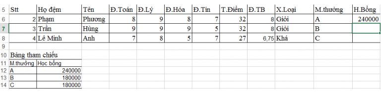 Để tìm kiếm giá trị mức thưởng của bảng tham chiếu và cho ra kết quả Học Bổng tương ứng với mức thưởng đó chúng ta làm như sau: