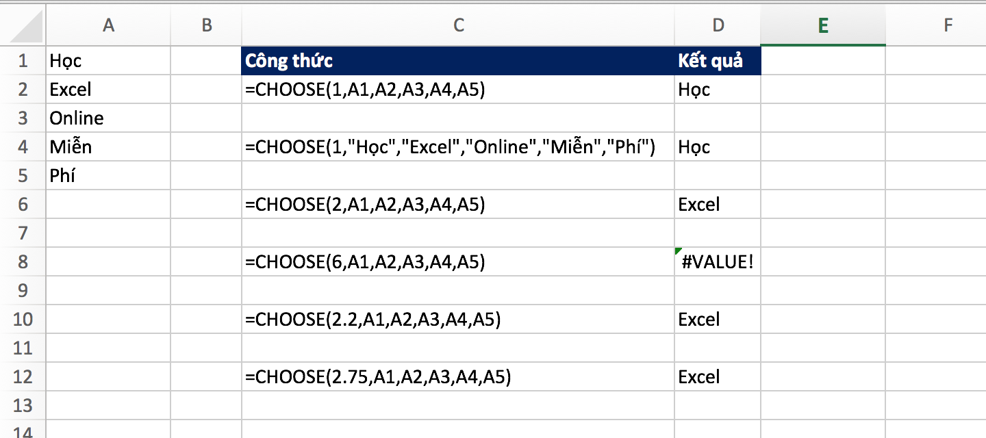 =CHOOSE({1,2},"Học","Excel","Online",'Miễn","Phí")