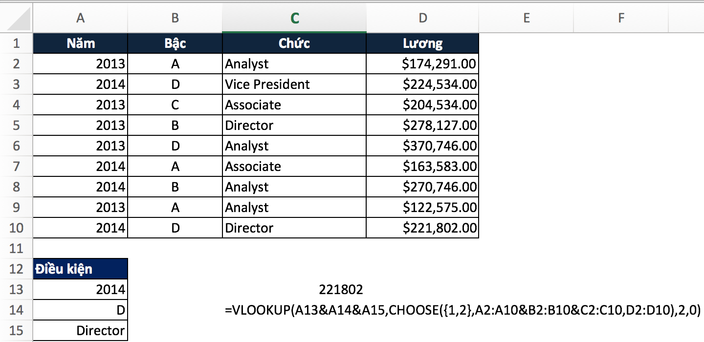 Ví dụ này được lưu trong Sheet3 của bảng tính ở phía trên. Trong ví dụ này, chúng ta có thể dùng kĩ thuật vừa được miêu tả để tra cứu dữ liệu từ cột D dựa trên dữ liệu ở cột A, cột B và cột C. Đến đây, hi vọng các bạn có thể xử lý thành thạo dù dữ liệu có đến từ bao nhiêu cột đi nữa.
