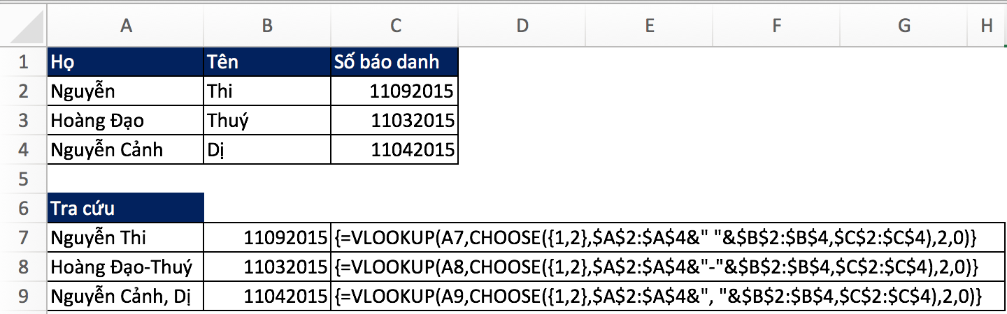 Ví dụ này có thể được tìm thấy trong Sheet4 của bảng tính phía trên. Chúng ta có 2 cột Họ và Tên, dựa trên 2 cột này chúng ta muốn tìm ra số báo danh của một người. Ở ví dụ này, cách nối Họ và Tên được sử dụng để tạo nên tên đầy đủ, có thể nối Họ và Tên bởi dấu cách, dấu nối, hoặc dấu phẩy cộng thêm dấu cách, các công thức được sử dụng cho từng trường hợp đó là (lưu ý, công thức mảng, nhấn CTRL + SHIFT + ENTERđể nhập):
