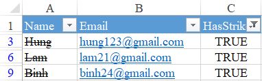 Bước 3: Kiểm tra các giá trị ở cột A có chứa format dạng dấu gạch ngang (strikeThrough) hay không