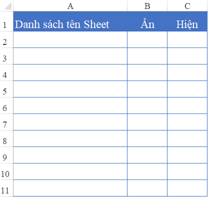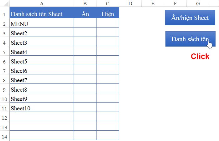 Tại Sheet MENU, bạn tạo 3 cột gồm: Danh sách tên Sheet, Ẩn, Hiện (Có thể trình bày, định dạng 1 chút cho bảng đó đẹp mắt)