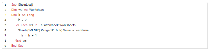 - Dòng 7: Biến lr bắt đầu từ giá trị là 2, với mỗi tên Sheet tìm được sẽ cộng tiếp 1 giá trị để điền vào dòng tiếp theo của cột A