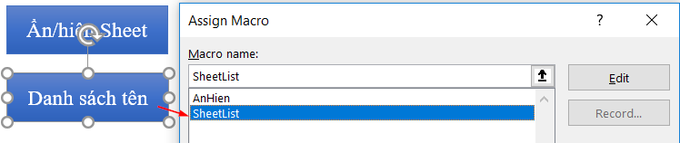 Gán Macro này vào nút lệnh Danh sách tên bằng thủ tục Assign Macro: