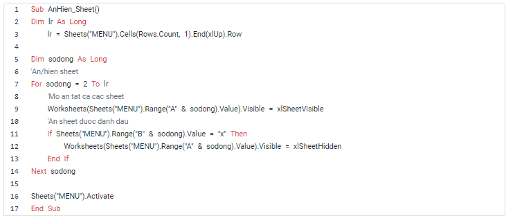 - Dòng 16: Sau khi hoàn thành hết vòng lặp, thực hiện kích hoạt Sheet MENU để không chọn tới Sheet nào khác (có thể xảy ra khi ẩn / hiện Sheet)