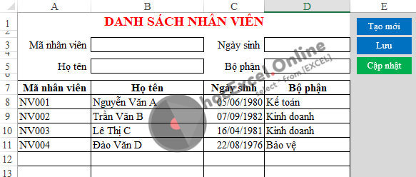 - Lưu dữ liệu tương ứng theo các nội dung: Từ ô B3 lưu vào cột Mã nhân viên, ô B5 lưu vào cột Họ tên… vị trí lưu sẽ là dòng trống tiếp theo trong bảng danh sách bên dưới.