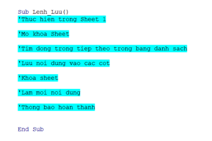 - Mở cửa sổ VBA, trong Module1 tạo 1 Sub có tên là Lenh_Luu
