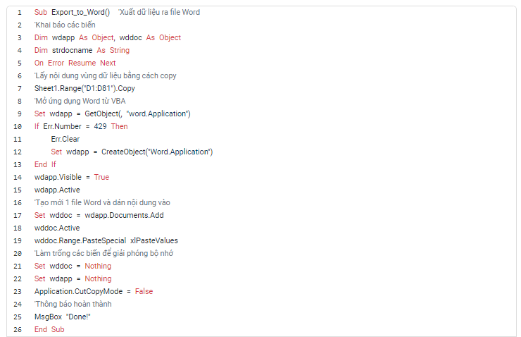 Dưới đây là câu lệnh VBA xuất dữ liệu ra file Word: