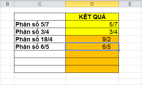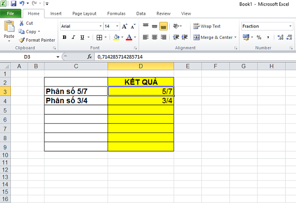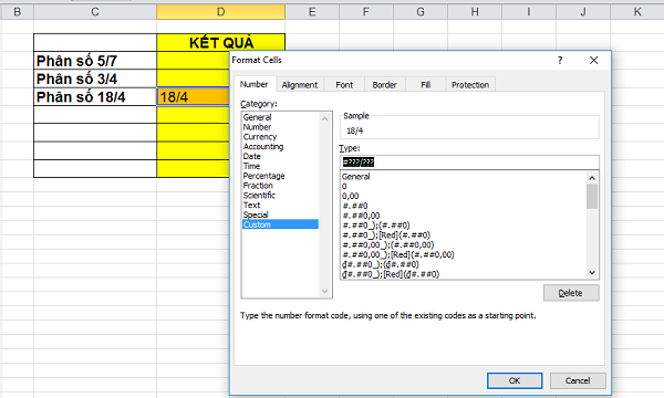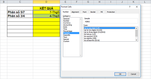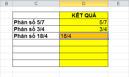=> Khi đó Excel sẽ hiển thị đúng dạng phân số.