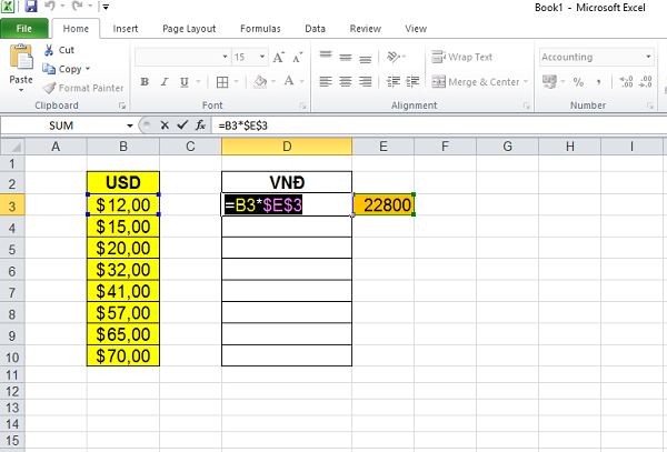 Bước 2: Trong ô D3 ở cột VNĐ, nhập công thức của =B3*$E$3. ( Trong đó thành phần $..$ dùng để cố định 1 đối tượng khi tính toán số liệu trong Excel, tạo bằng cách ấn F4 sau khi bạn chọn ô F3).