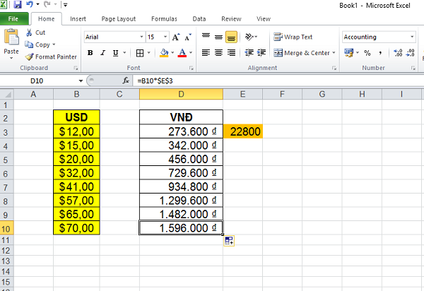 Bước 1: Tìm hiểu các tỷ giá hối đoái hiện nay giữa đồng USD và VNĐ và nhập nó vào một ô trống. (Ô E3 trong ví dụ)
