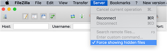 Trong Filezilla, bạn có thể buộc nó hiển thị các file ẩn bằng cách nhấp vào Server > Force showing hidden files từ thanh menu.