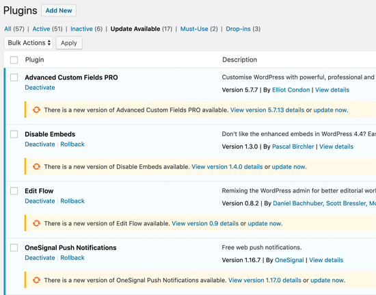 Tiếp theo, bạn sẽ cần phải đăng nhập vào dashboard trong WordPress và kích hoạt từng plugin một, để xem plugin nào gây ra sự cố. Sau đó, bạn cần cài đặt bản cập nhật plugin theo cách thủ công, để nó hoạt động bình thường.