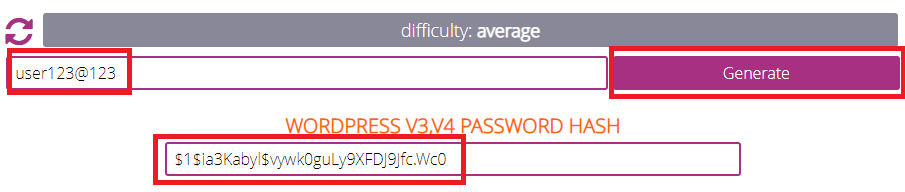 Bạn truy cập một trong các trang này (tại đây hoặc tại đây) để tạo 1 password mới mà bạn muốn, giả sử bạn muốn password mới là user123@123 thì website này sẽ tạo ra 1 đoạn văn bản mã hóa password ở ô bên dưới. Bạn copy lại để sử dụng cho bước tiếp theo