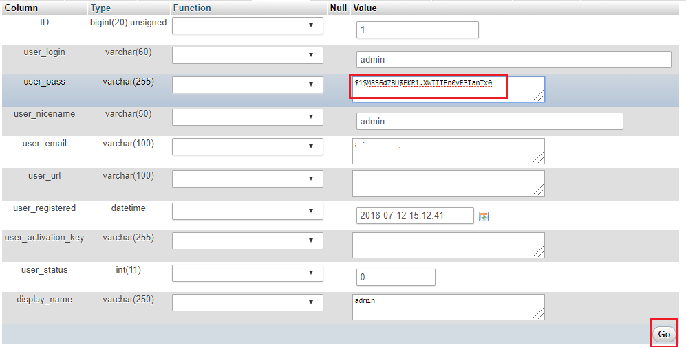 Tìm đến trường user_pass và dán mật khẩu mới sau khi mã hóa mà bạn tạo ra ở bước 1 rồi Click Go để lưu lại.