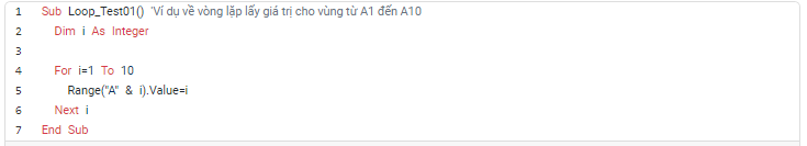 Có 2 loại vòng lặp thường sử dụng là For-Next Loop và Do-Loop. Sau đây chúng ta cùng tìm hiểu về cách sử dụng vòng lặp For-next.