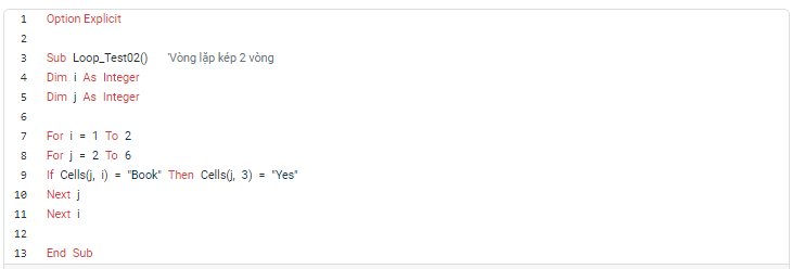 Đôi khi chúng ta cần thực hiện nhiều vòng lặp lồng nhau trong cùng 1 câu lệnh VBA, khi đó chúng ta cần sử dụng vòng lặp kép.