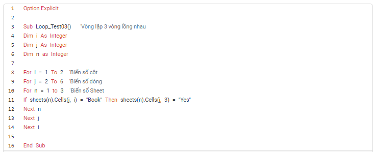 Tương tự với vòng lặp 2 vòng, chúng ta có thể tạo ra vòng lặp kép 3 vòng với việc xét đồng thời 1 yếu tố nữa về Sheet để có thể mở rộng phạm vi hoạt động cho nhiều sheet cùng lúc