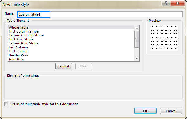 4. Ở phần Table Elements, chọn yếu tố mà bạn muốn định dạng và chọn Format. Hộp Format Cells sẽ mở ra, và bạn chọn định dạng mong muốn ở phần Font, Border và Fill.