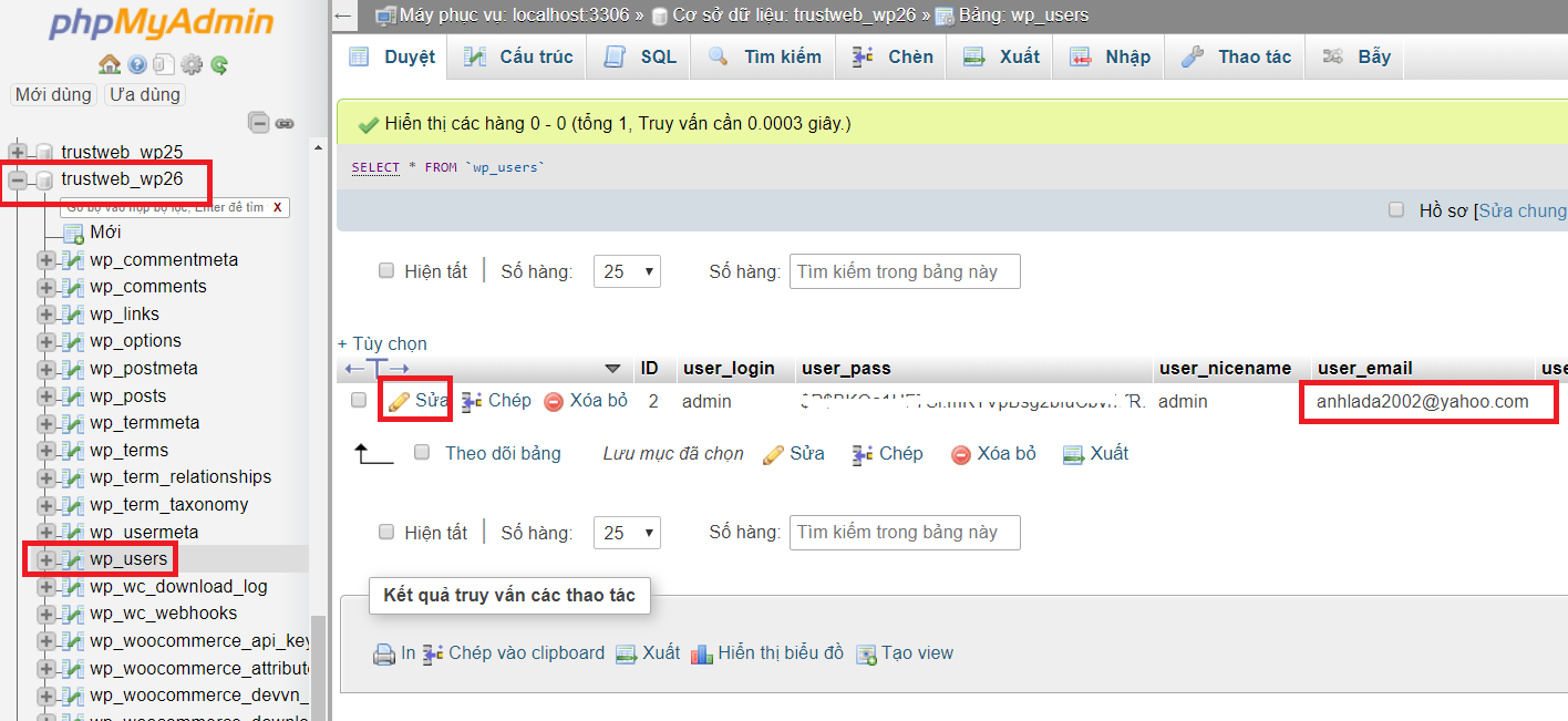 Cách 2: Thay đổi email thông qua phpMyAdmin