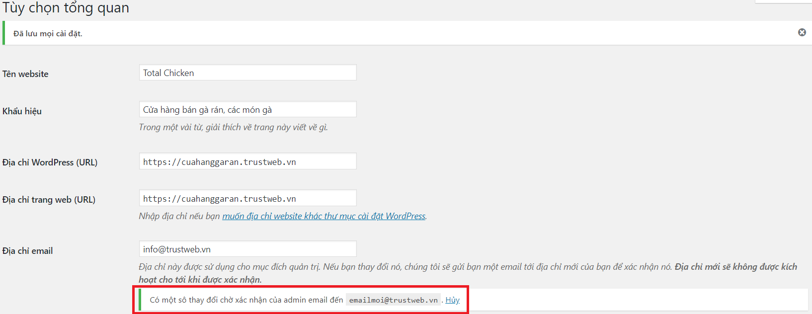 Khi thay đổi email admin trong Cài đặt – Tổng quan, bạn sẽ thấy thông báo như hình bên dưới: