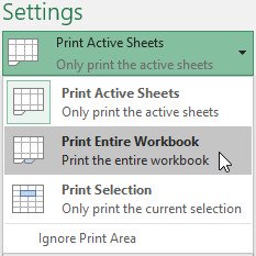 2. Chọn Print Entire Workbook (In toàn bộ bảng tính) từ trình đơn thả xuống Print Range (Vùng in).