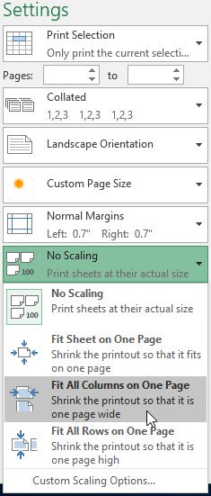 2. Chọn tuỳ chọn mong muốn từ trình đơn thả xuống Scaling. Trong ví dụ, chúng tôi sẽ chọn Fit All Columns on One Page.