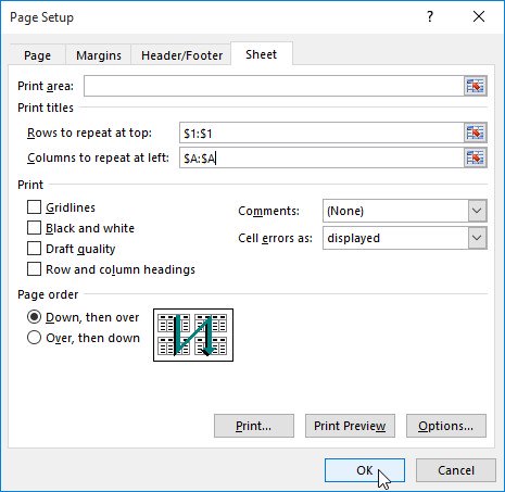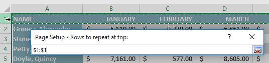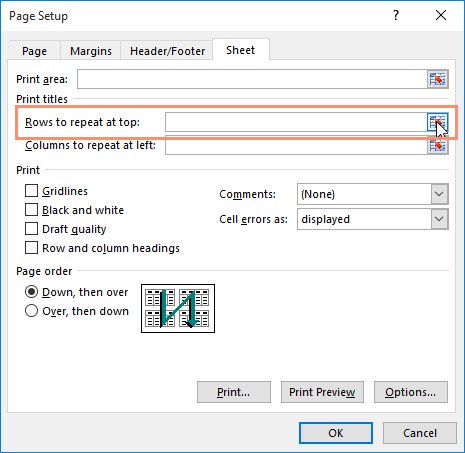 2. Hộp thoại Page Setup (Cài đặt trang) sẽ xuất hiện. Từ đây, bạn có thể chọn hàng hoặc cột lặp lại trên mỗi trang. Trong ví dụ, chúng tôi sẽ lặp lại hàng đầu tiên.